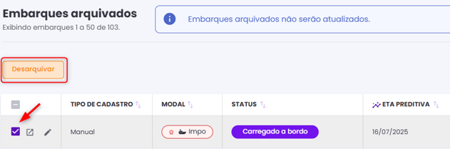 Embarques desarquivados voltam e ser atualizados e ficam visíveis na sua lista de Meus embarques.