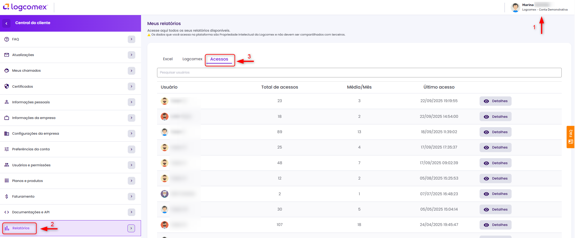 Como acompanho os acessos dos usuários cadastrados na conta da minha empresa?