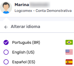 - Pelo menu principal: clique no seu nome no canto superior direito da tela e escolha a opção Alterar idioma. Em seguida, selecione Português (BR), English (US) ou Español (ES).