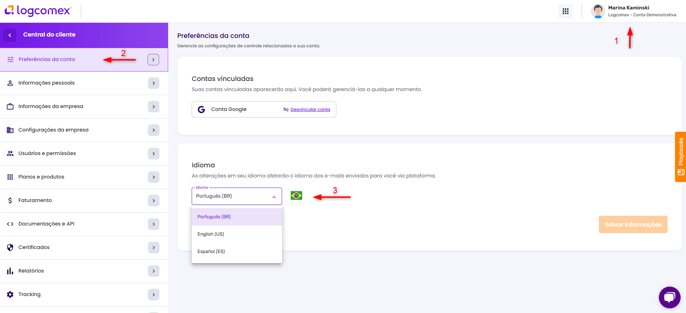 - Pelas preferências da conta: clique no seu nome no canto superior direito da tela e selecione a opção Central do Cliente. No menu esquerdo, clique na opção Preferências da conta, selecione o idioma de preferência e então clique em Salvar informações.