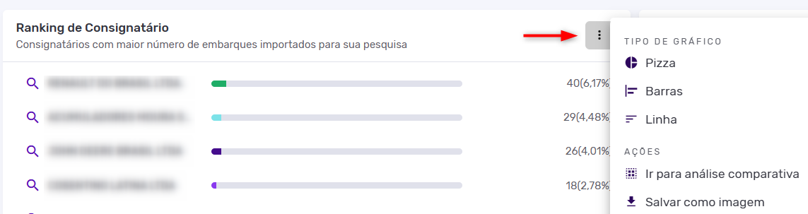Após feitos os filtros desejados no menu lateral esquerdo do Shipment Intel Ocean Import, você conseguirá visualizar o ranking de consignatários em um bloco na aba de dashboard.