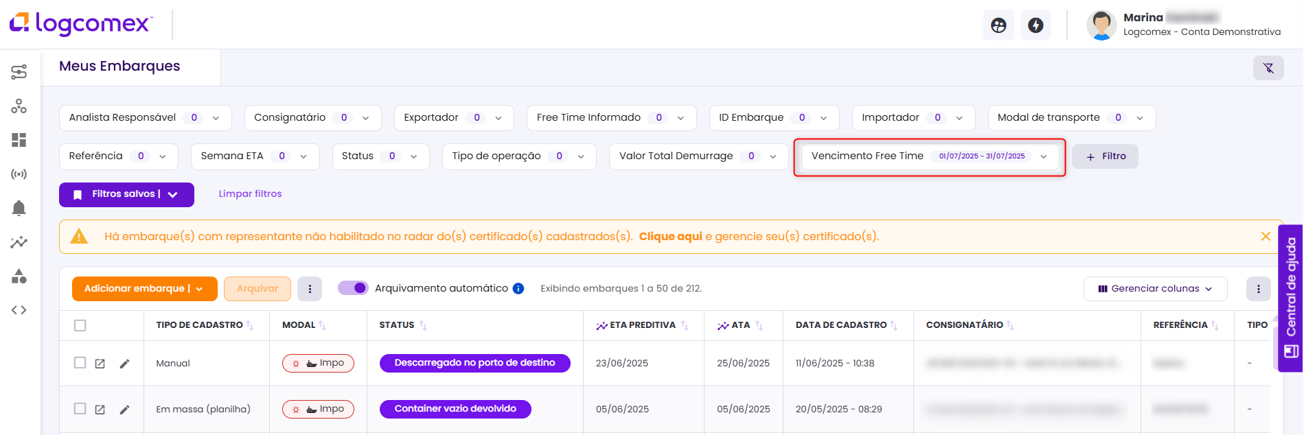 Para consultar os embarques com free time vencido, basta acessar a aba de Meus embarques e utilizar os filtros disponíveis na plataforma. É possível aplicar filtros por status do free time, buscando especificamente os que já foram vencidos ou que estão com demurrage em curso.
