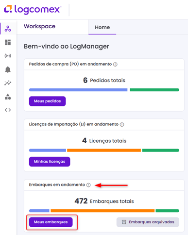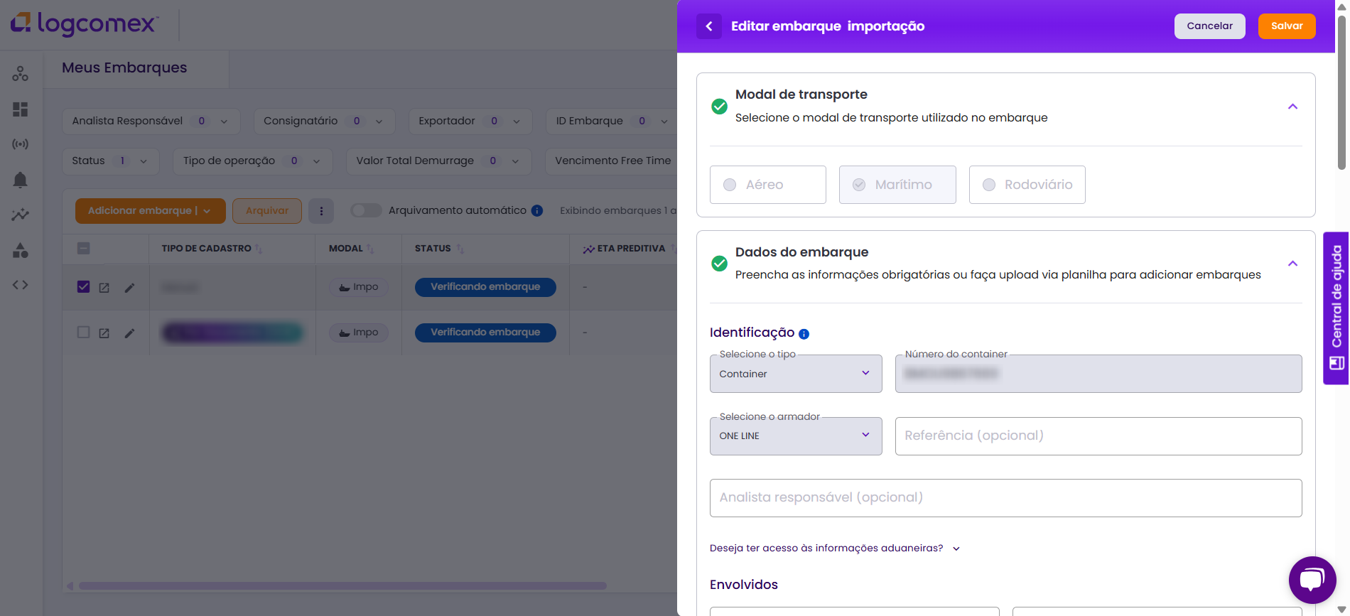 Embarques sem status: Possibilitam a edição dos campos referência de embarque (BL, HBL, MBL, Container, Booking), referência interna, analista, free time, PO e LI.