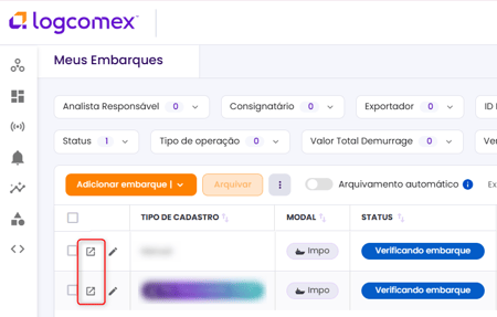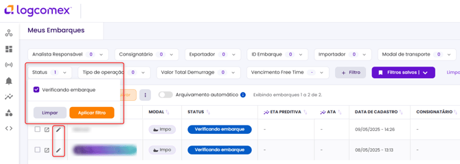 - Você pode utilizar os filtros disponíveis para encontrar o embarque desejado, como por exemplo Status igual a Verificando embarque;