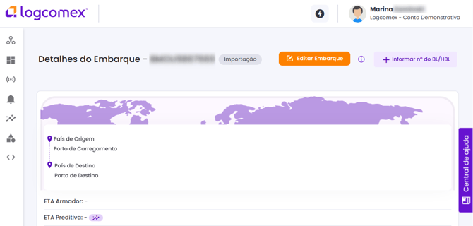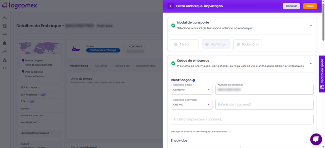 Embarques sem status: Possibilitam a edição dos campos referência de embarque (BL, HBL, MBL, Container, Booking), armador, referência interna, analista, free time, PO e LI.