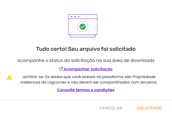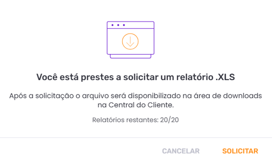 Pronto! Seu arquivo foi solicitado. Depois disso, ele estará disponível no seu e-mail ou na Central do Cliente na aba Relatórios. O arquivo estará disponível para download por 5 dias corridos. Após esse período, será necessário realizar uma nova solicitação de extração em excel.