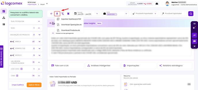 Importante: a extração de relatório em excel está disponível conforme o plano contratado. Caso não possua essa funcionalidade incluída no seu plano, entre em contato com o seu Gerente de Contas pelo e-mail guardioes@logcomex.com para saber mais como contratá-la.