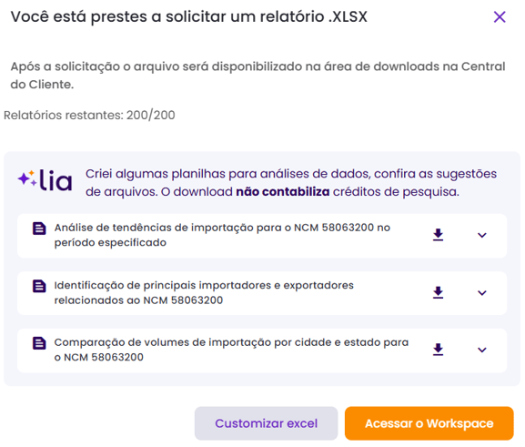 Ao optar pelo download em excel, você receberá algumas sugestões de análises da LIA, nossa agente de inteligência artificial. Você poderá acessá-las clicando no botão de download ou seguir com a personalização do seu arquivo excel, clicando em Customizar excel.