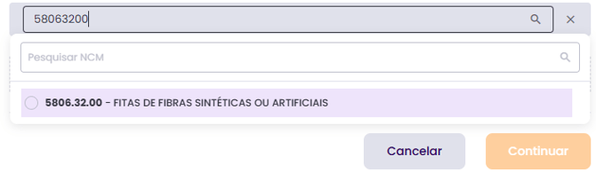 Digite o novo número da NCM, selecione-a e clique em Continuar.