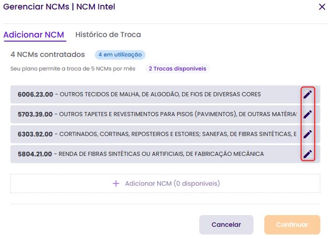 Vagas preenchidas: O ícone de edição (lápis) só fica disponível quando você esgota o limite total de NCMs do seu plano. Se ainda houver vagas, o sistema permitirá apenas a inclusão de uma nova.