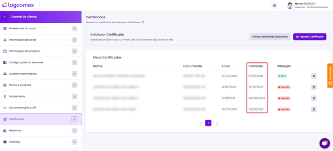 Clique no seu nome no canto superior direito da tela e selecione a opção Central do Cliente. No menu esquerdo, clique na opção Certificados. Nesta tela é possível visualizar a informação da data de envio, validade do certificado e situação (de acordo com a validade - se ativo ou não). Caso o certificado esteja vencido ou a vencer, você receberá um alerta 30 dias antes do vencimento.
