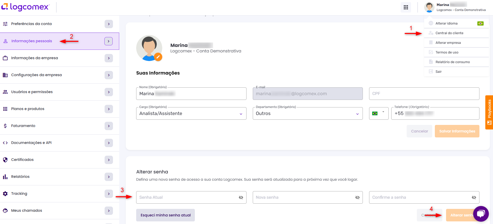 No menu esquerdo, clique na opção Informações pessoais. Ao final da página, você verá a tela para alterar a sua senha. Insira a senha atual, a nova senha e repita a nova senha. Depois disso, clique em Alterar senha.