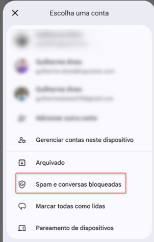 Acesse o menu (geralmente um ícone de perfil ou três pontos) e selecione a opção Spam e conversas bloqueadas.