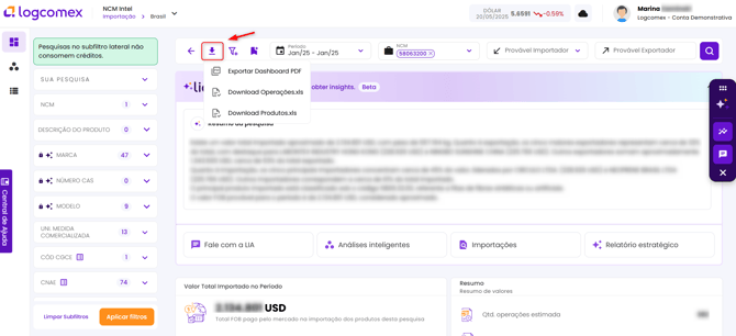 A melhor experiência de análise e cruzamento de dados acontece diretamente no ecossistema da Logcomex. No entanto, se você precisar de um suporte visual para uma apresentação ou um registro estático de uma consulta, o NCM Intel permite a geração de arquivos em PDF ou Excel.