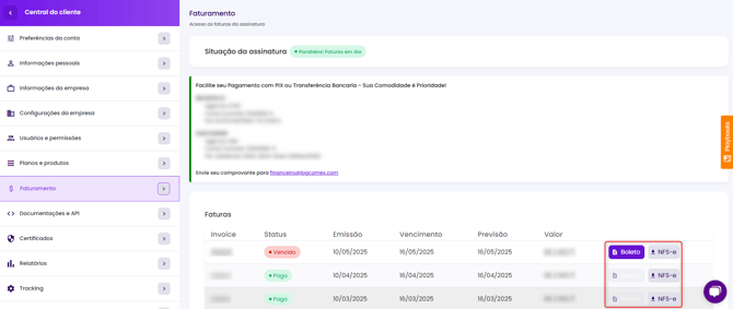 Pelo status, você consegue acompanhar o que está pendente. Para visualizar o boleto, clique no ícone roxo. Para visualizar a NF, clique no ícone de NFS-e. Aqui também é possível acompanhar a data de vencimento e valor, além de ter acesso aos dados para pagamento via PIX ou transferência bancária, se for de sua preferência. Neste caso, envie o comprovante de pagamento para financeiro@logcomex.com