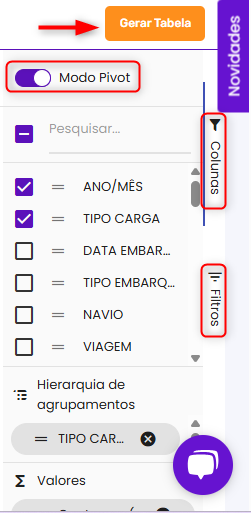 Na barra lateral direita, clique em Colunas, depois em Modo Pivot e selecione até 11 informações que você gostaria de analisar por coluna, linha ou filtro. Você consegue arrastar as colunas conforme a sua necessidade. Depois disso, não esqueça de clicar em Gerar Tabela.